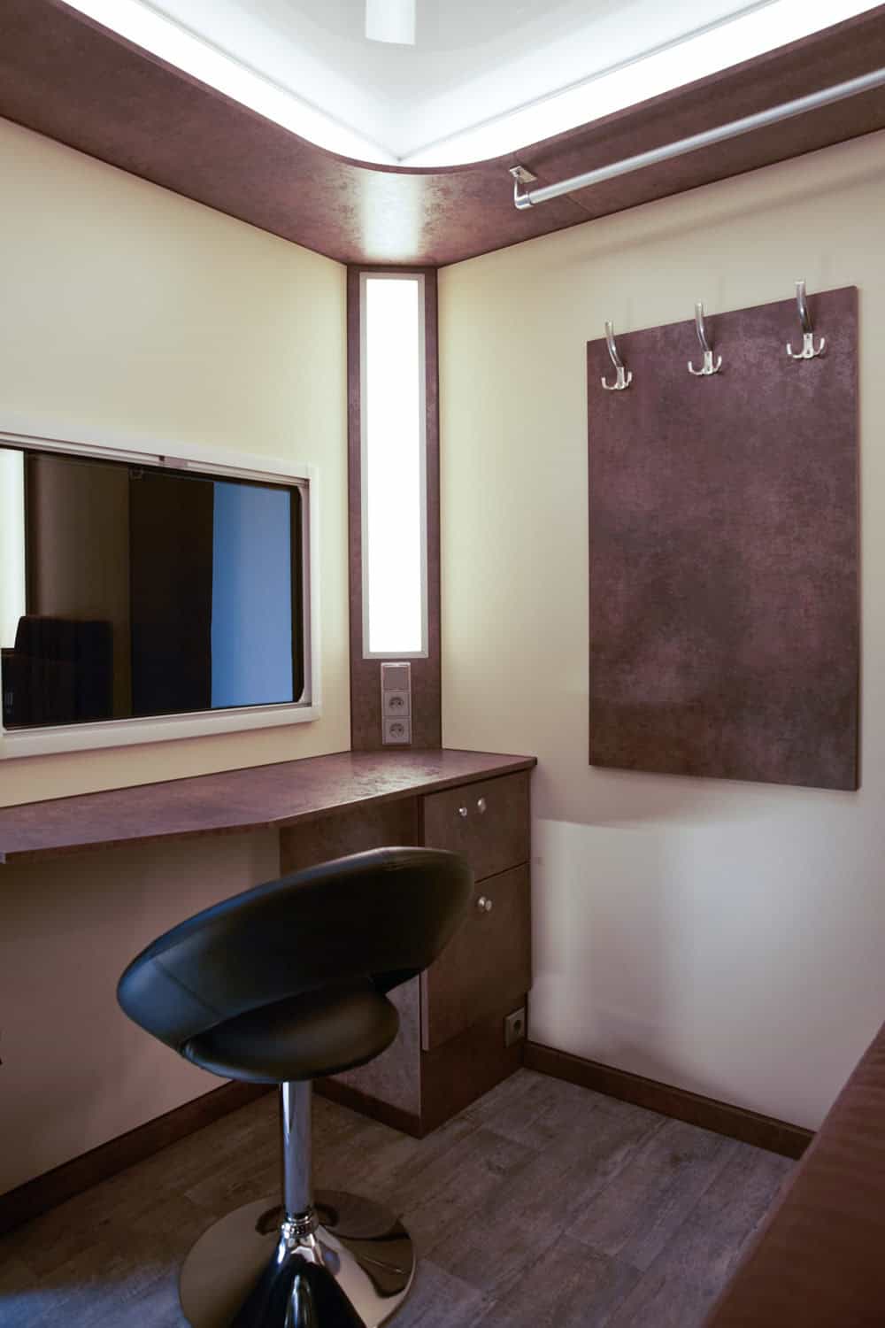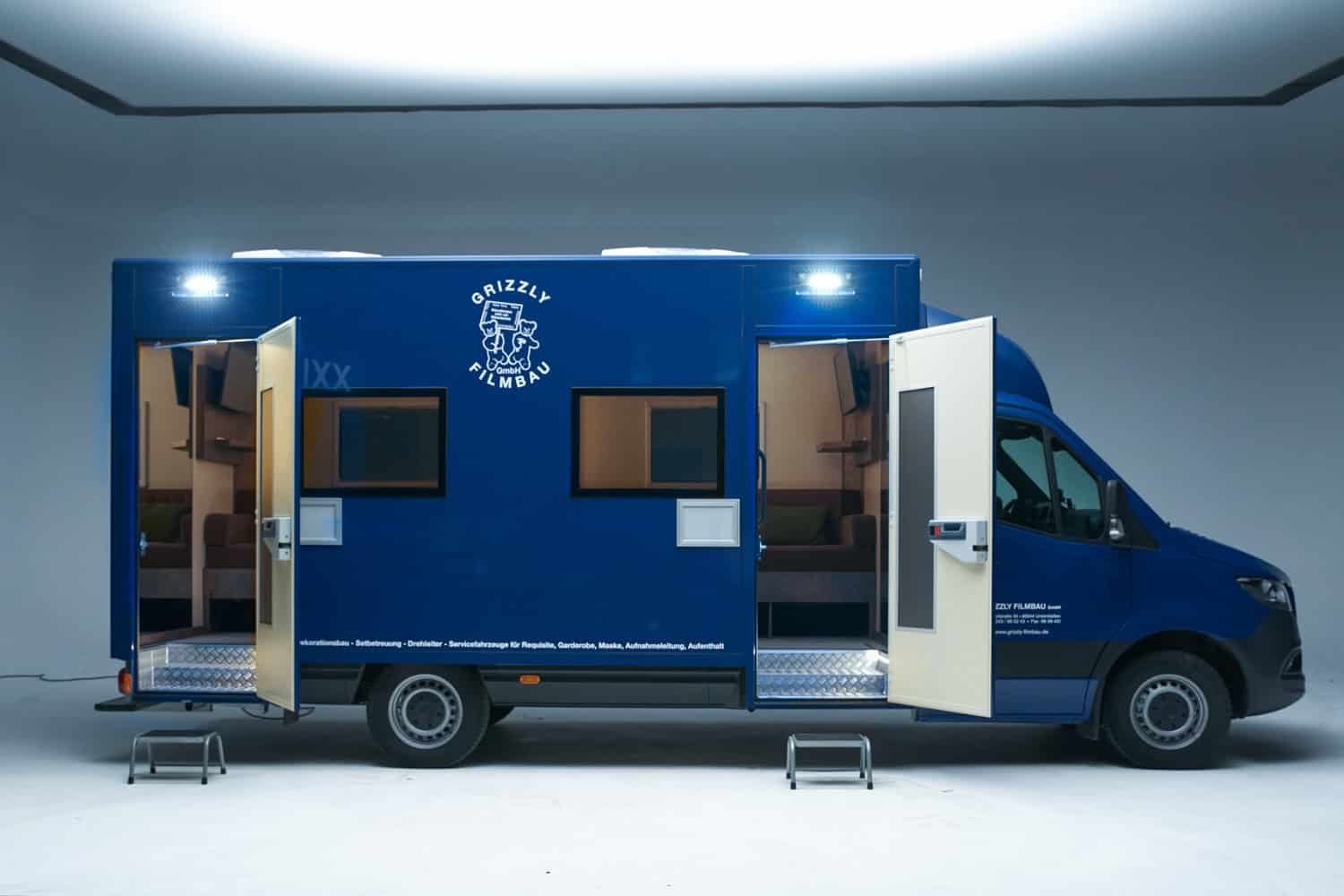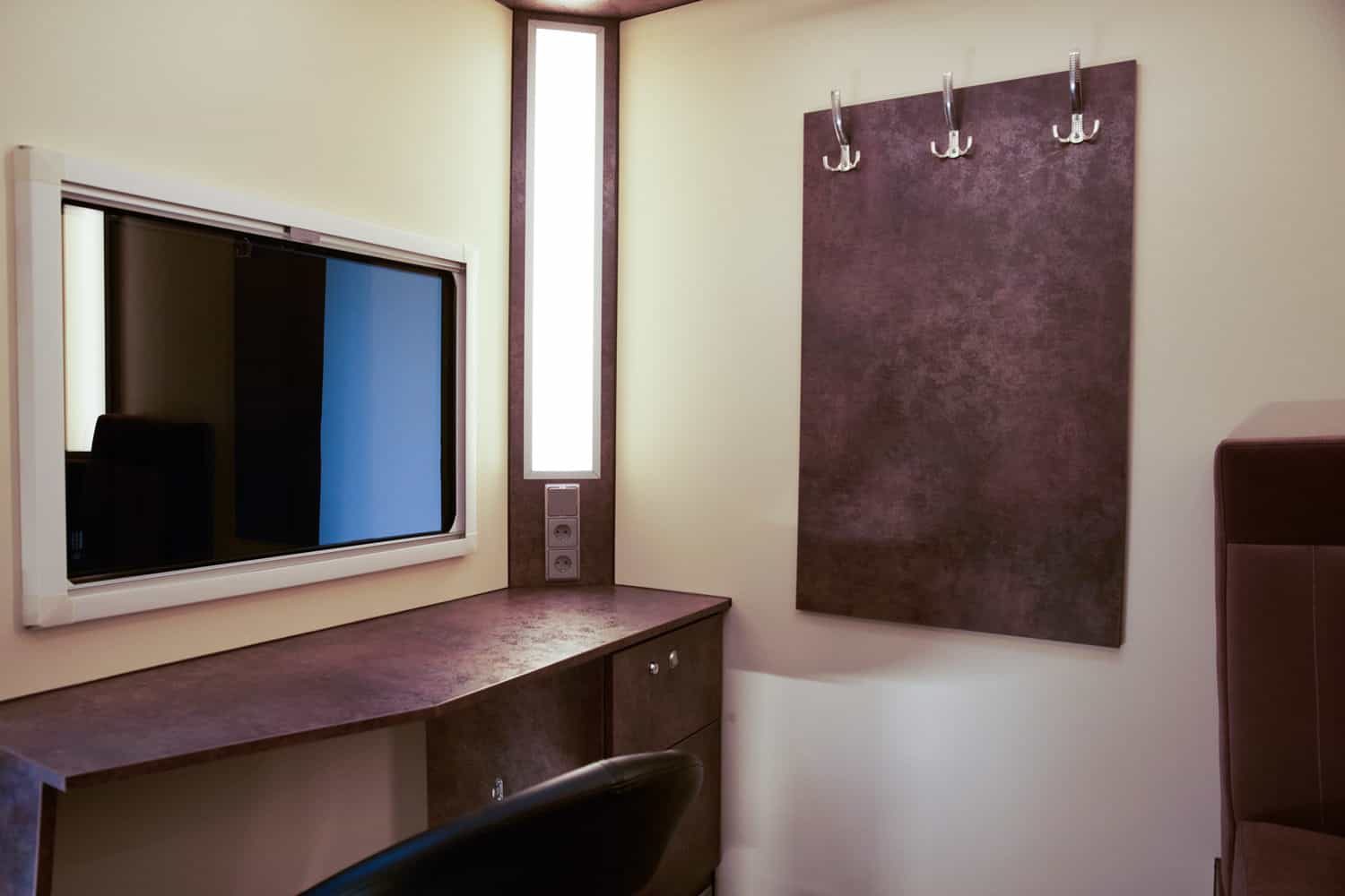Um eine erholsame Ruhepause der Schauspieler zu gewährleisten, verfügen beide Kabinen über eine Schlafcouch mit je 2m Länge, sowie ein Schreibtisch und Fernseher. Die eingebaute Klimaanlage und Standheizung sorgen für angenehme Temperaturen bei jedem Wetter.