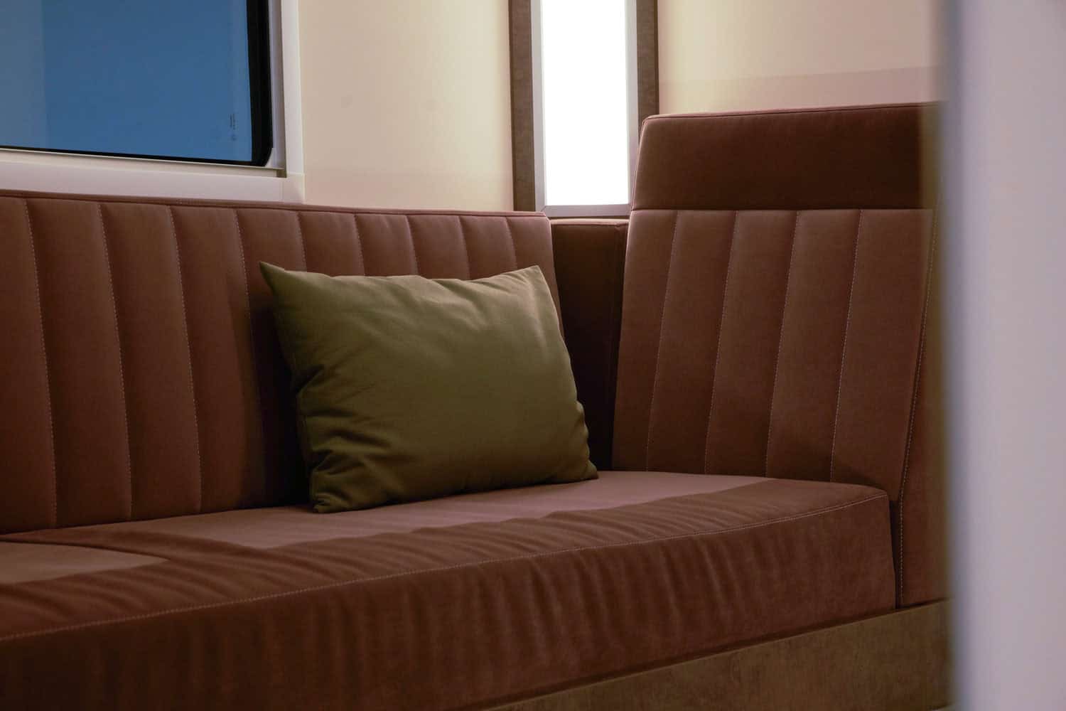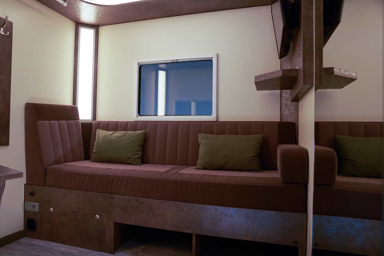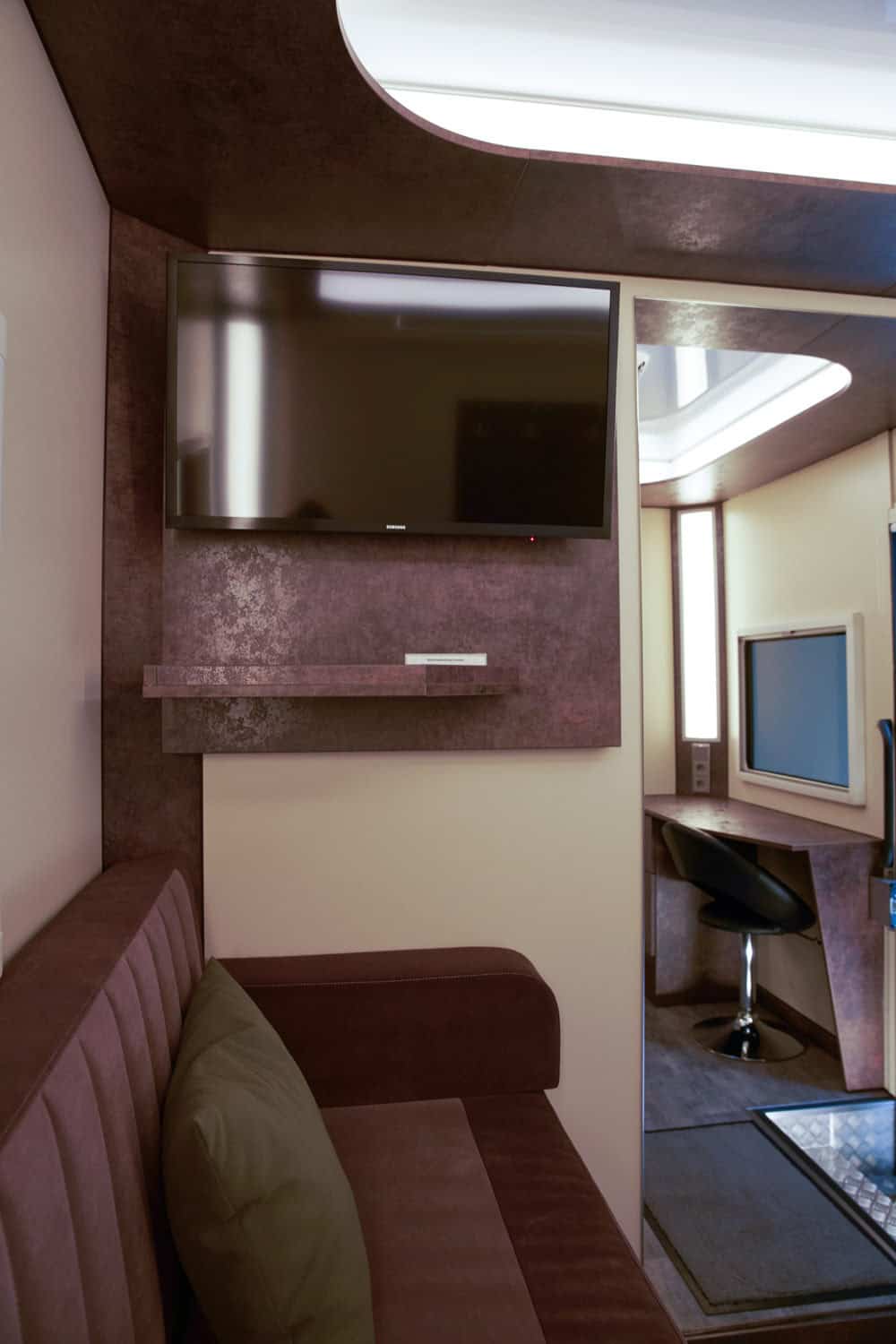 Um eine erholsame Ruhepause der Schauspieler zu gewährleisten, verfügen beide Kabinen über eine Schlafcouch mit je 2m Länge, sowie ein Schreibtisch und Fernseher. Die eingebaute Klimaanlage und Standheizung sorgen für angenehme Temperaturen bei jedem Wetter.