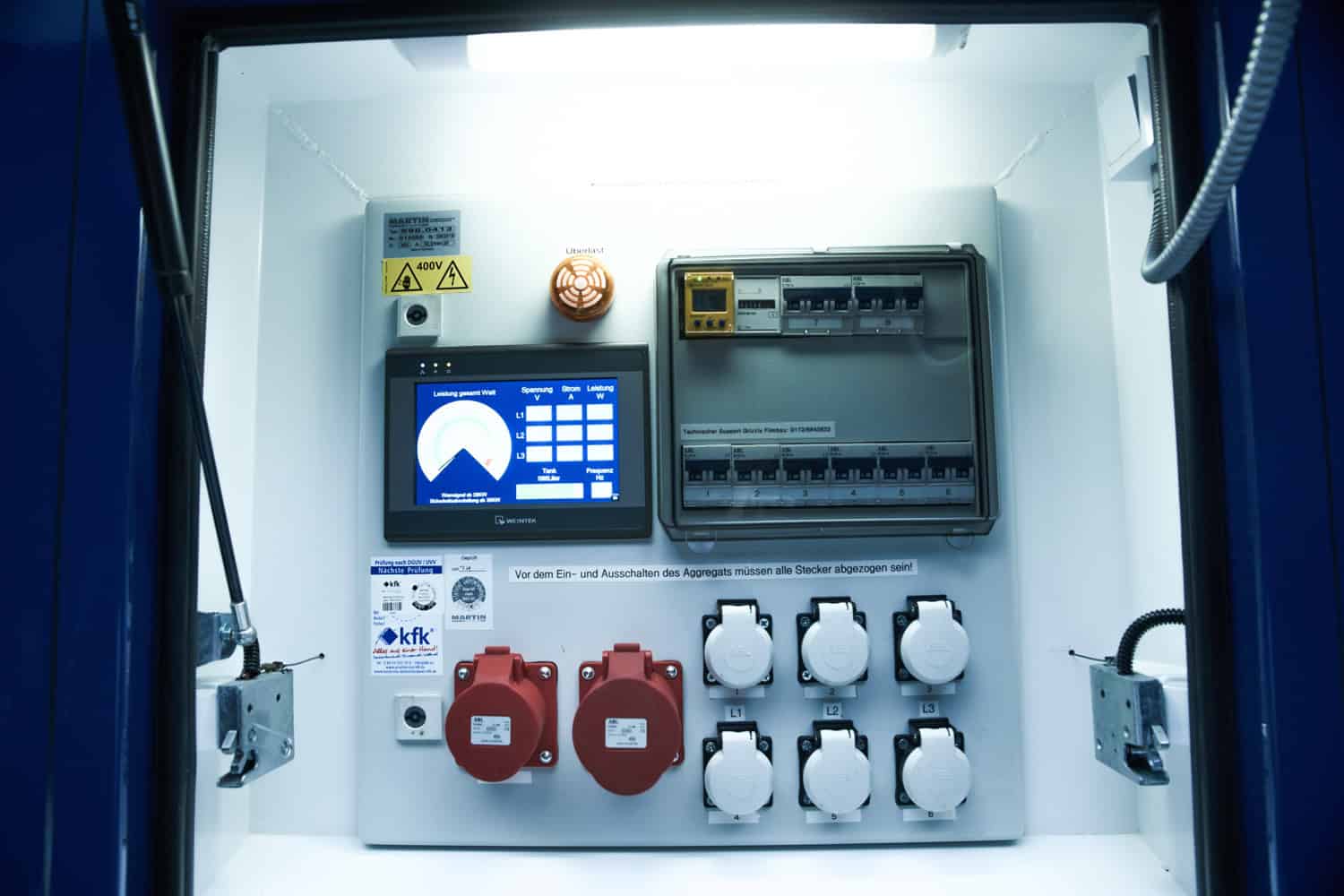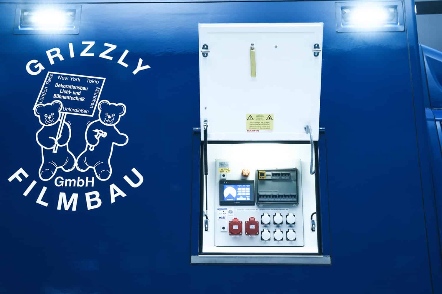 Mit unserem Servicefahrzeug Set AL bist du bestens gerüstet, es verfügt über einen 30KW Unterfluraggregat – angetrieben über den Fahrzeugmotor. Es stehen folgende Steckdosen bereit: 6 x Schuko, 1 x 16A CEE, 1 x 32A CEE. Die Schutzschaltung wird mit einem Isowächter realisiert – hierdurch entfällt der sonst notwendige Erdungsstab.