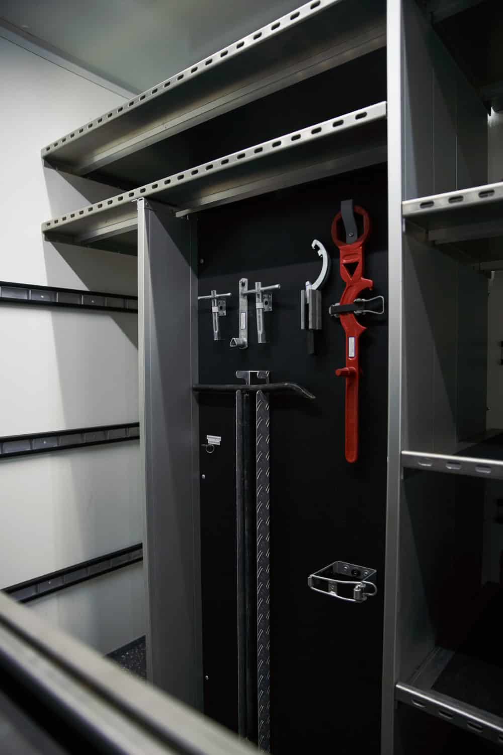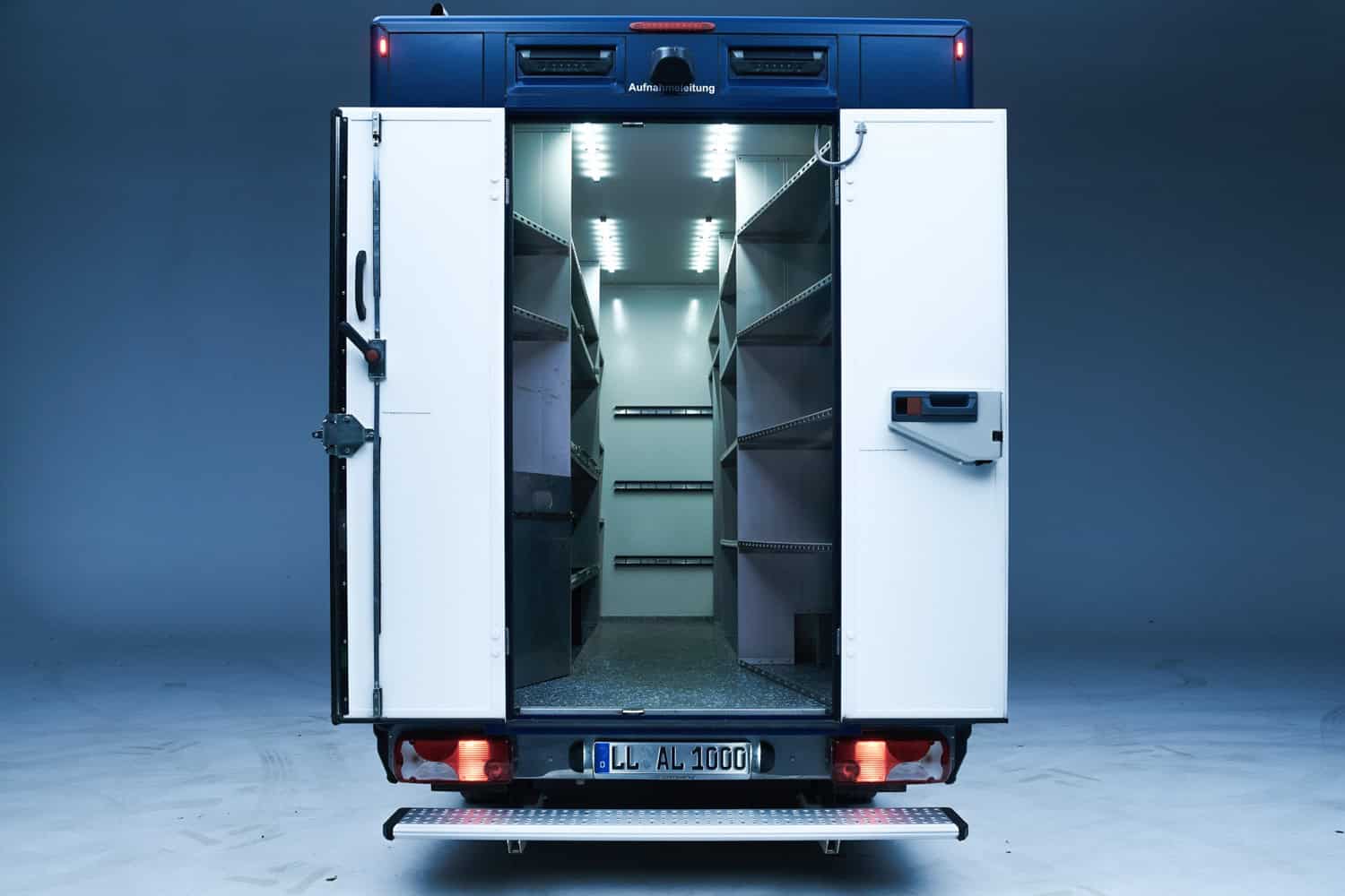 Der Aufbau ist ein isolierter Integralkoffer mit festen Regaleinbauten zur Lagerung der gesamten Ausrüstung des Aufnahmeleiters sowie Biertischgarnituren, Zelten und Gasflaschen. In einem Regalfach bietet sich Platz für den Walkiekoffer, wo über einen Spannungswandler 12/230V die Akkus dauerhaft auch ohne Aggregatbetrieb geladen werden können.